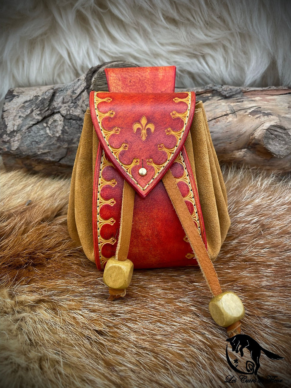 Bourse de ceinture rouge et jaune avec bordure décorative et fleur de lys